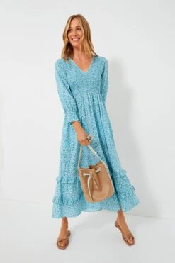 In a vibrant, cool blue that has us wishing for time spent poolside, the Acqua Paige Dress is a stunning midi. The ruffled stand collar, gathered neckline with smocking, and short puff sleeves with a wide band all create special details that set this style apart, while a voluminous A-line silhouette ensures a twirl-worthy fit that moves with you. Pair with sandals and sunglasses for a chic lunchtime outfit, or style with heels and a clutch to go dancing with the girls!