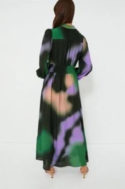 Turn heads in the Green Fade Amber Dress by Baum Und Pferdgarten- a sleek silhouette with an abstract multi-color fabric, this dress is alluring and eye-catching while also being functional. This collard maxi features a button closure at the neck with a keyhole opening, elasticized sleeves, and stretchy smocking at the waist for a comfortable fit. Style with heels and simple earrings for a classy, fun look.