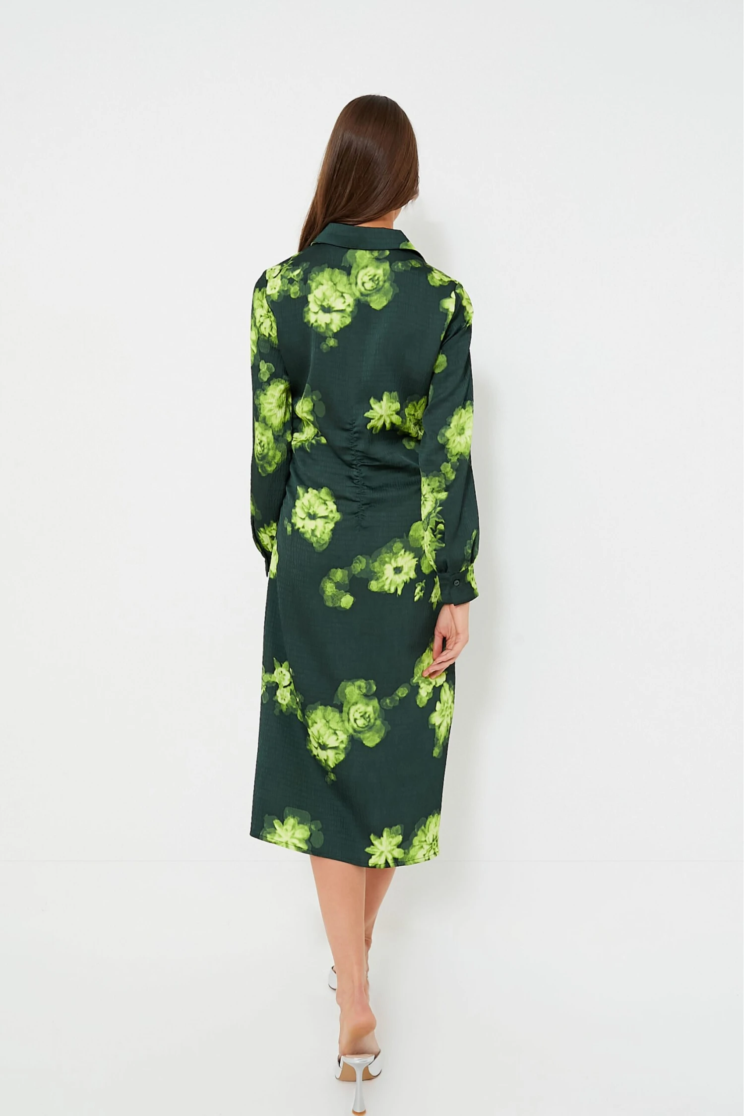 Elevate your style effortlessly with this statement piece – the Margot Flower Abira Dress, perfect for making a lasting impression. Featuring luxe green hue, this midi can be dressed up or down, season after season. This fitted style seamlessly combines sophisticated details like a front button closure, buttoned cuffs and ruching at the sides to give a flattering drape. From sandals to sneakers, heels to flats, we are constantly reaching for this maxi for easy day to night transitions, desk to drinks, and everything else all season long.