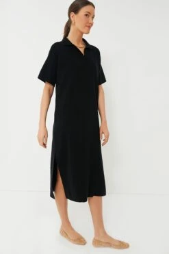 Relaxed silhouette, loose sleeves, side slits at the hem — the Black Channing Polo Dress is your new go-to for casual-cool styling. Cut from a lightweight stretch knit fabric that was made to effortlessly flatter, this lovely midi is finished with a spread collar and v-neckline combo that adds a hint of nostalgic flair we’re obsessed with. Pair it with strappy sandals on your next vacay, with sneakers and sunnies around town, or with flats and a tote for a lunch date since it’s just that versatile.