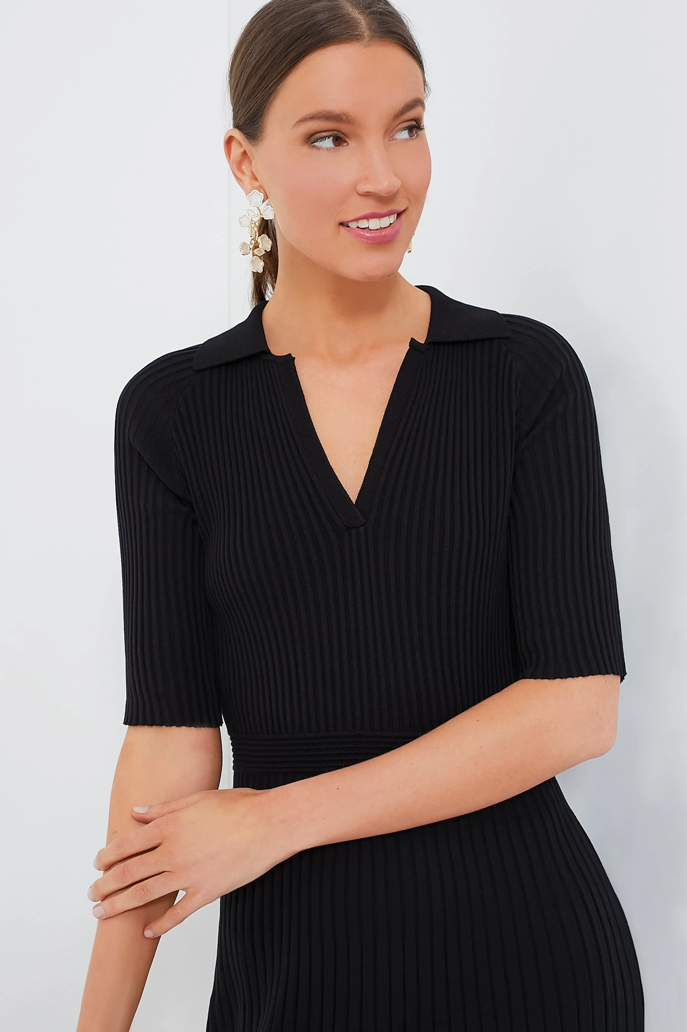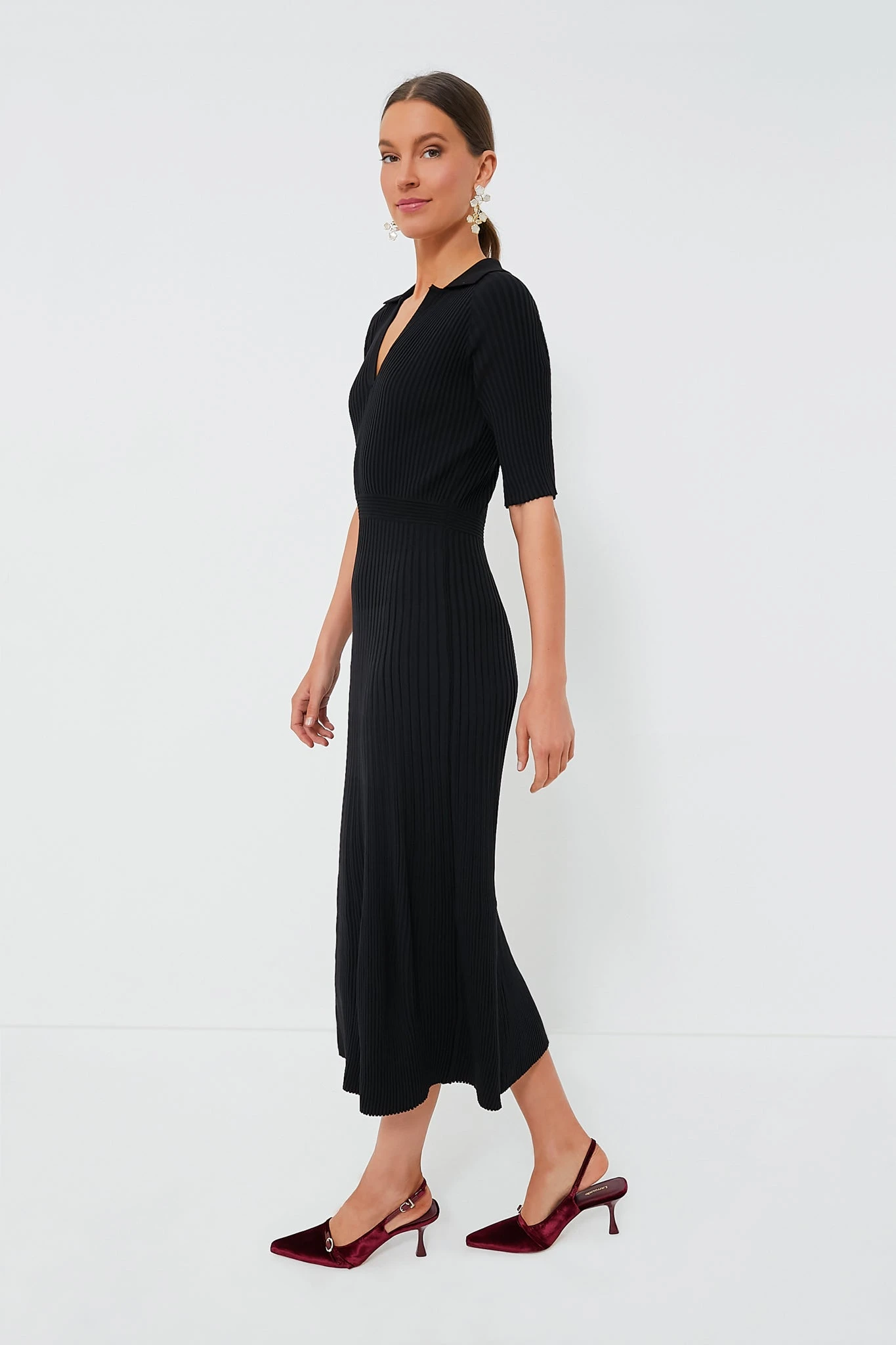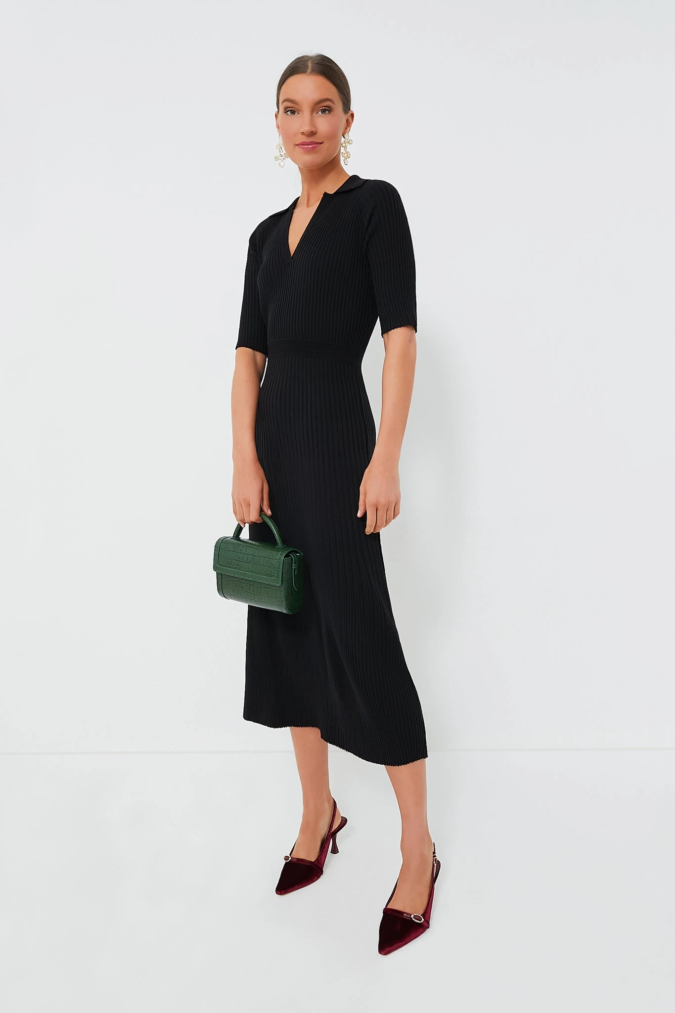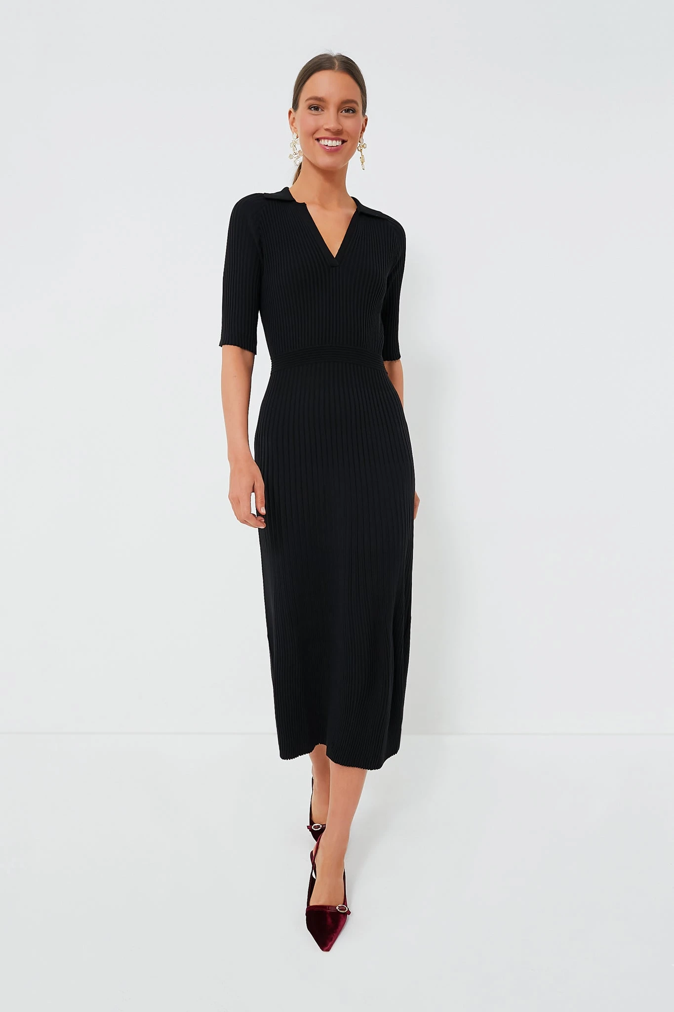 Exude effortless elegance in the Black Knit Janie Dress. Deceptively simple, this maxi has a few details that come together to pack a chic punch (think spread collar, V-neckline, and elbow-length sleeves), yet gets most of its cool-factor from the slim and stretchy silhouette that will elongate the body and flatter the figure. Team it with slingback heels and gold jewelry for a timeless look, or style it with knee boots and a clutch for a slightly funkier take.