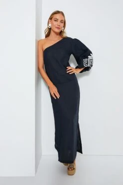 The Blue Agatti Maxi Dress is a classy, feminine silhouette that is comfortable while still being elevated. With a one-shoulder design and dramatic puff sleeve with embroidered detailing, this eye-catching maxi will turn heads at any function. Pair with heels and gold jewelry for a formal look, or with sandals and a tote for a more laid-back outfit.