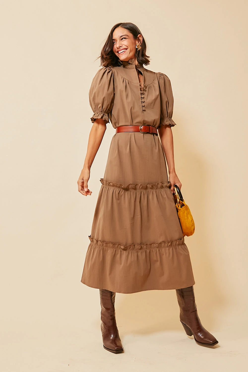 Modeled off of one of our favorite blouses, the Selena Maxi Dress is sure to be your new favorite number for everything from brunch to girls night to busy weekends and everything else in between. Full of romantic details like a ruffle stand collar, front placket finished with covered buttons, and flutter detailing on the cuffs and skirt, this puff sleeve piece is fun and feminine. The styling options are endless– boots, flats, heels, sneakers…must we continue? This day to night stunner does it all!