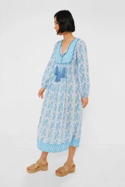 The Cornflower Blue Kitty Dress is the perfect throw-and-go style, constructed from Indian cotton in an easy silhouette. The neck tie tassels and contrast hem add flair to the graceful blue and purple pattern, making this a versatile midi that can carry you throughout the day. Pair this with sandals or wedges and statement earrings for an effortlessly beautiful look.