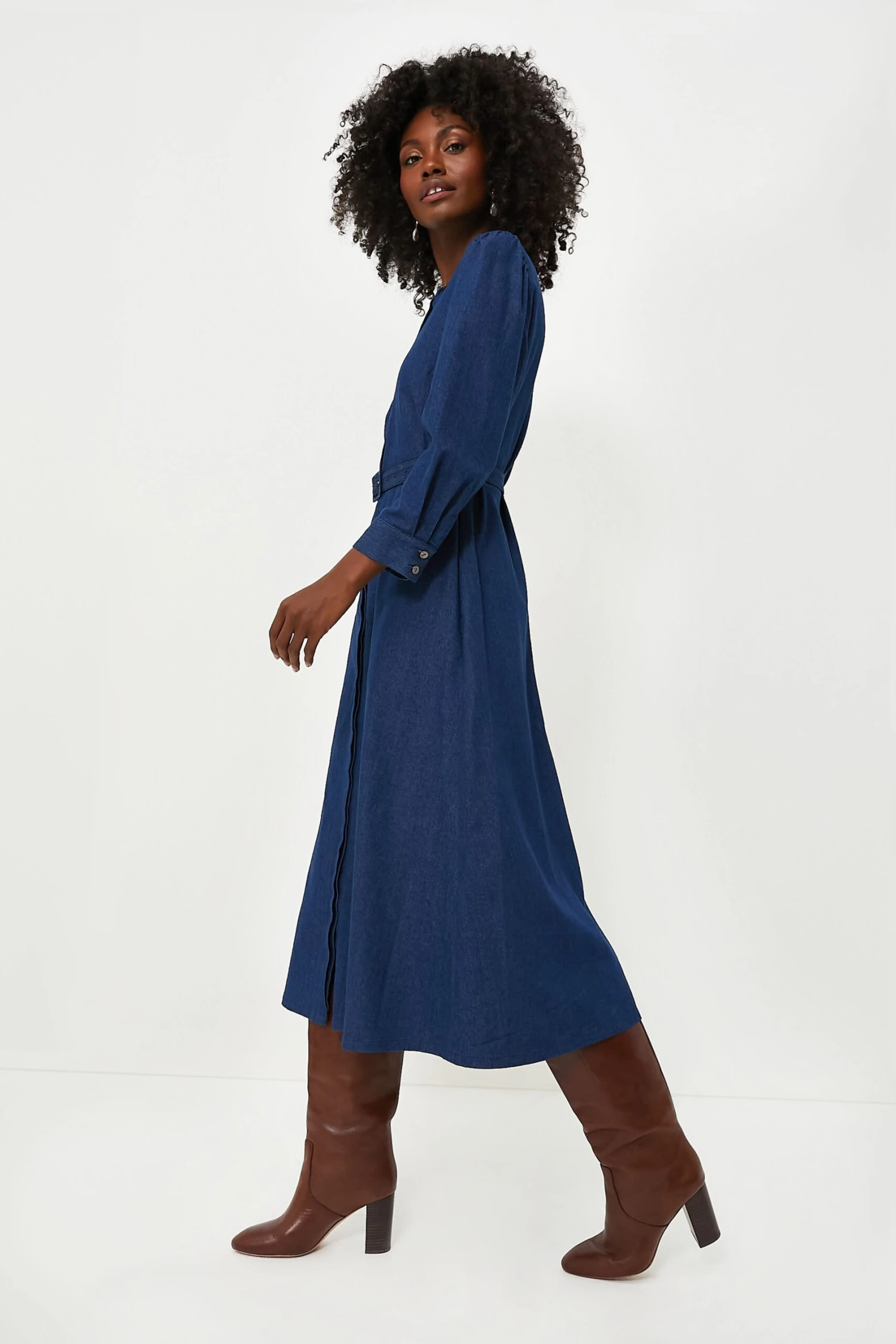The Catherine Dress is the perfect anytime, anywhere closet staple piece. The chambray fabric keeps it casual while the elegant length, covered front placket and matching belt add elements of formality without feeling stuffy and situational. Complete with hidden side seam pockets, slightly puff shoulders and an easy neckline, this midi can be styled with everything from heels to boots to loafers season after season.