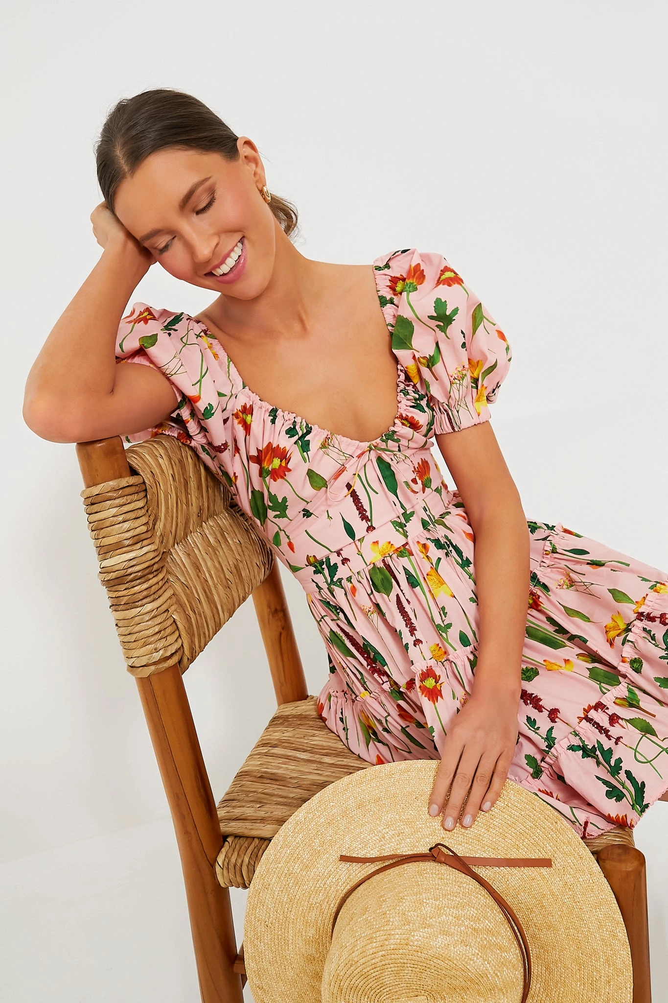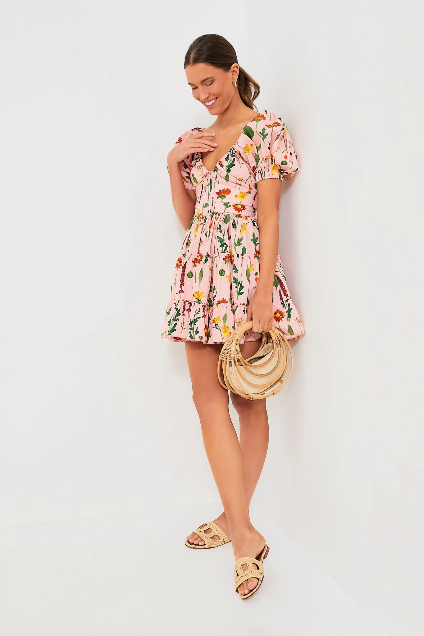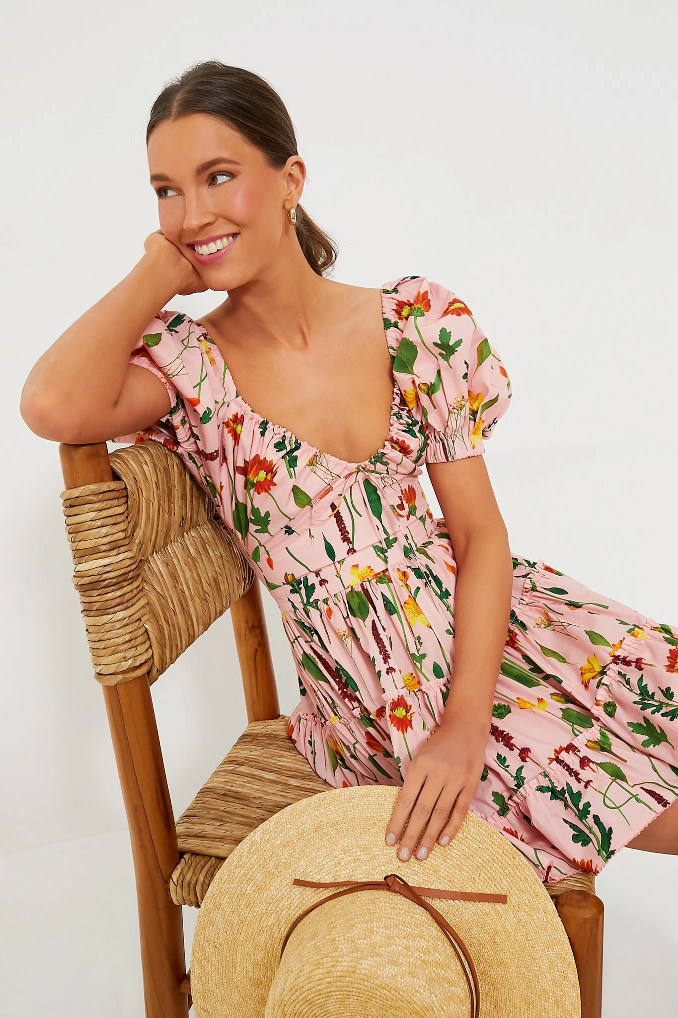 A well-loved silhouette in a new Tuckernuck exclusive print, the Pink Floral Manzanilla Dress is ultra-chic. With its delicate botanical pattern, this mini is a cheerful choice that features a deep V-neckline that can be adjusted with the tie at the base, short puff sleeves, and a flirty hem length. Cut from light cotton, this fresh and feminine silhouette is the quintessential piece for sun-filled days and tropical nights — just add your favorite sandals and you’re good to go!