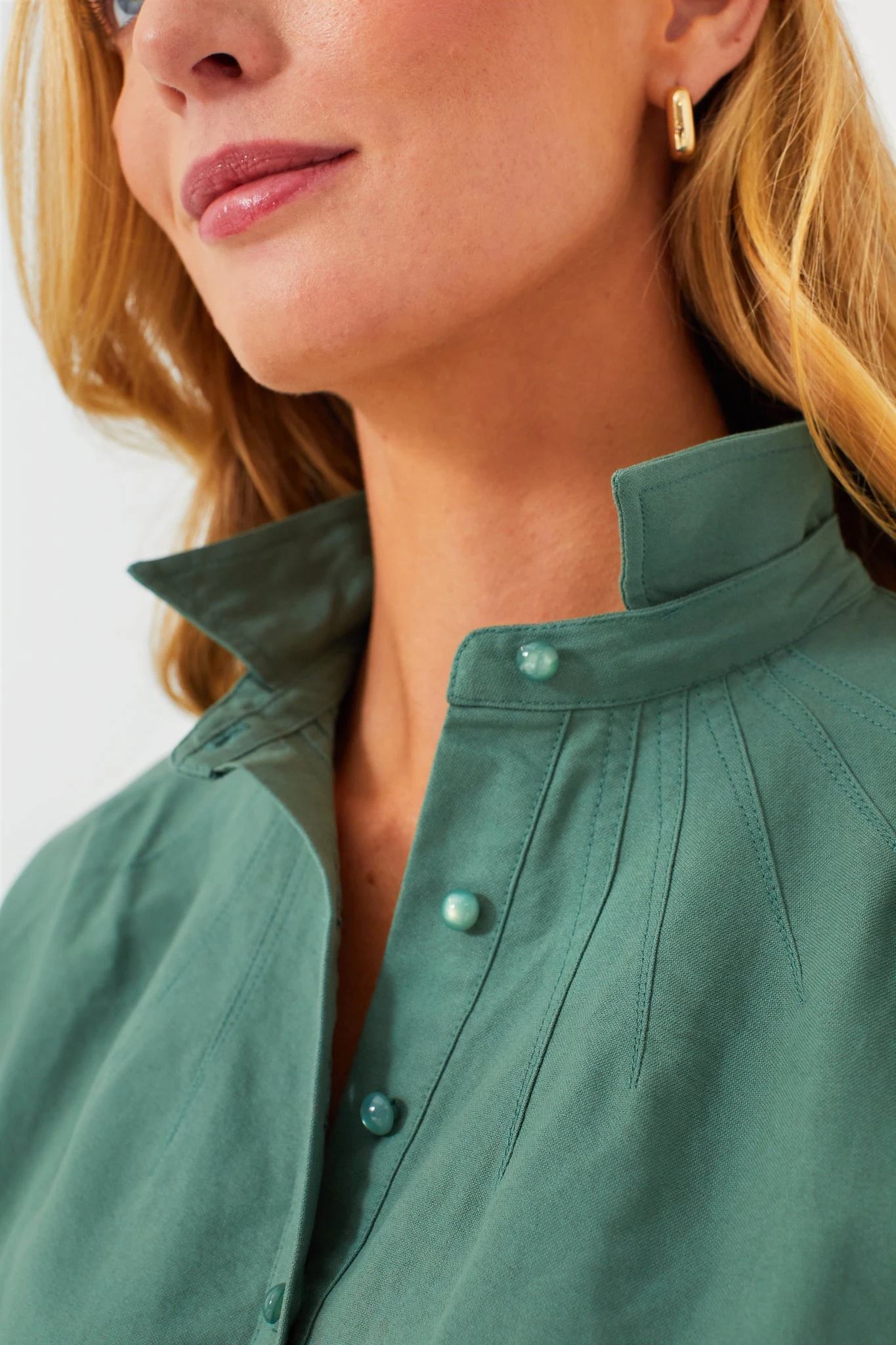 - Partial button front placket with tonal buttons