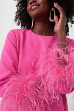 Retro glam meets modern mini with the Mod Mary Dress. This fabulous hot pink number features a wearable silhouette that’s elevated by eye-catching details — you can’t miss the extraordinary, high-quality feather embellishments on the sleeve cuffs that take this stunner from cool to show-stopping. Perfect for glitzy gatherings and evening events, pair this beauty with heels and metallic accessories for a jaw dropping look.