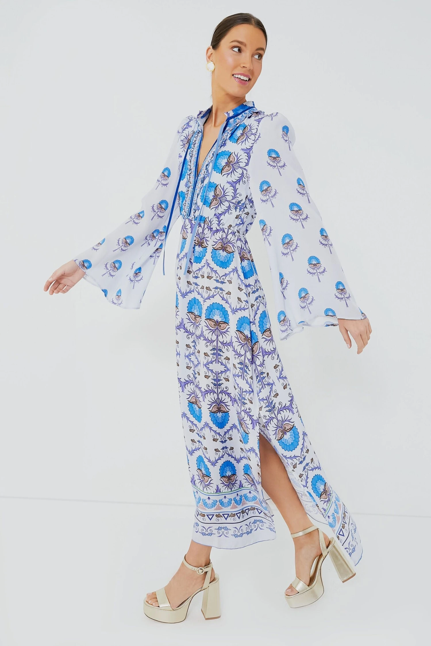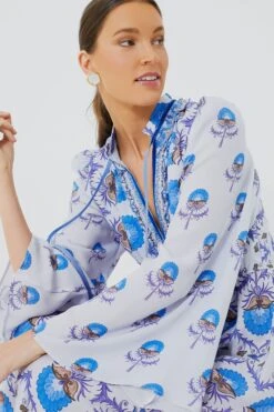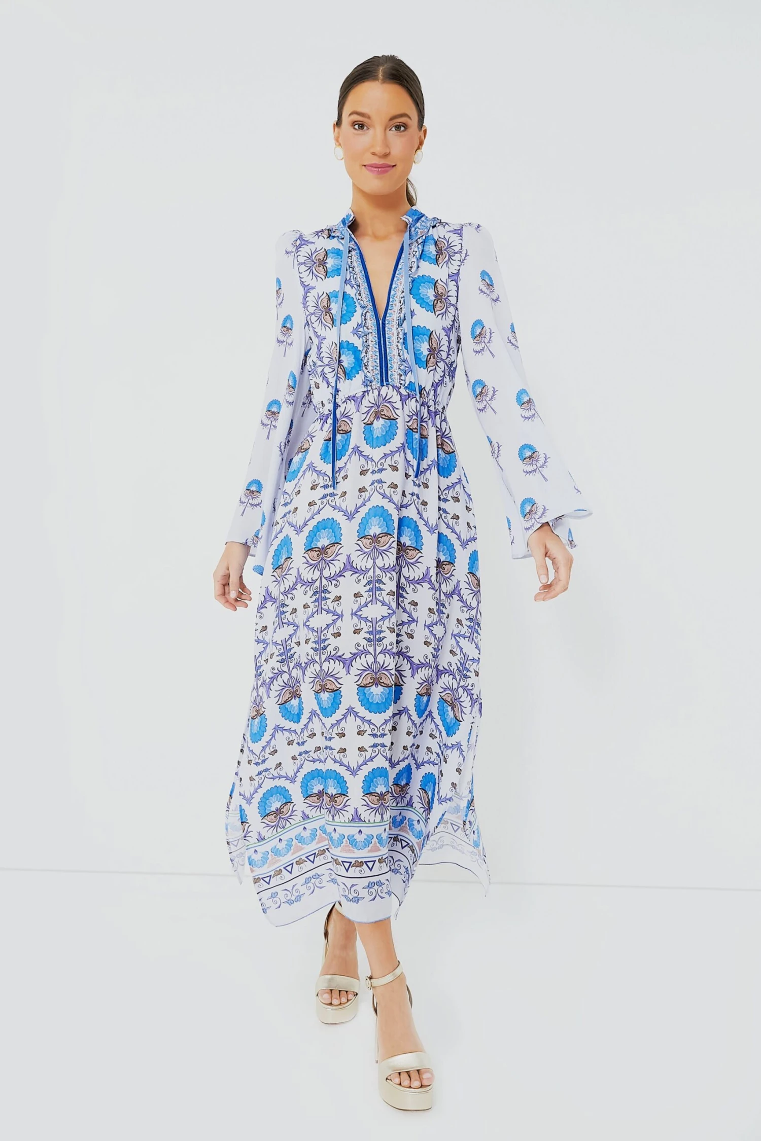 The Light Blue Tess Dress with a ruffled, V-neckline works beautifully for midday gatherings and soirées alike. Boasting an elasticized waistline and smocked bodice that pools into voluminous sleeves, this look is chic and care-free. The cool-toned pattern is airy and feminine, making this the perfect all-occasion dress.