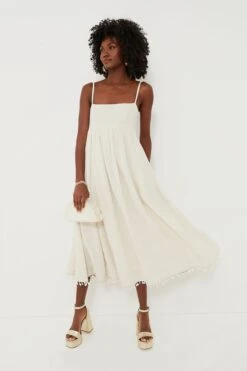 The Gavin Dress is a captivating midi. A neutral light sand color and simple silhouette are accented with a puka shell hem and back bow. Pair with sandals and a crossbody for a lunch date, or with heels and a clutch for a more elevated look.