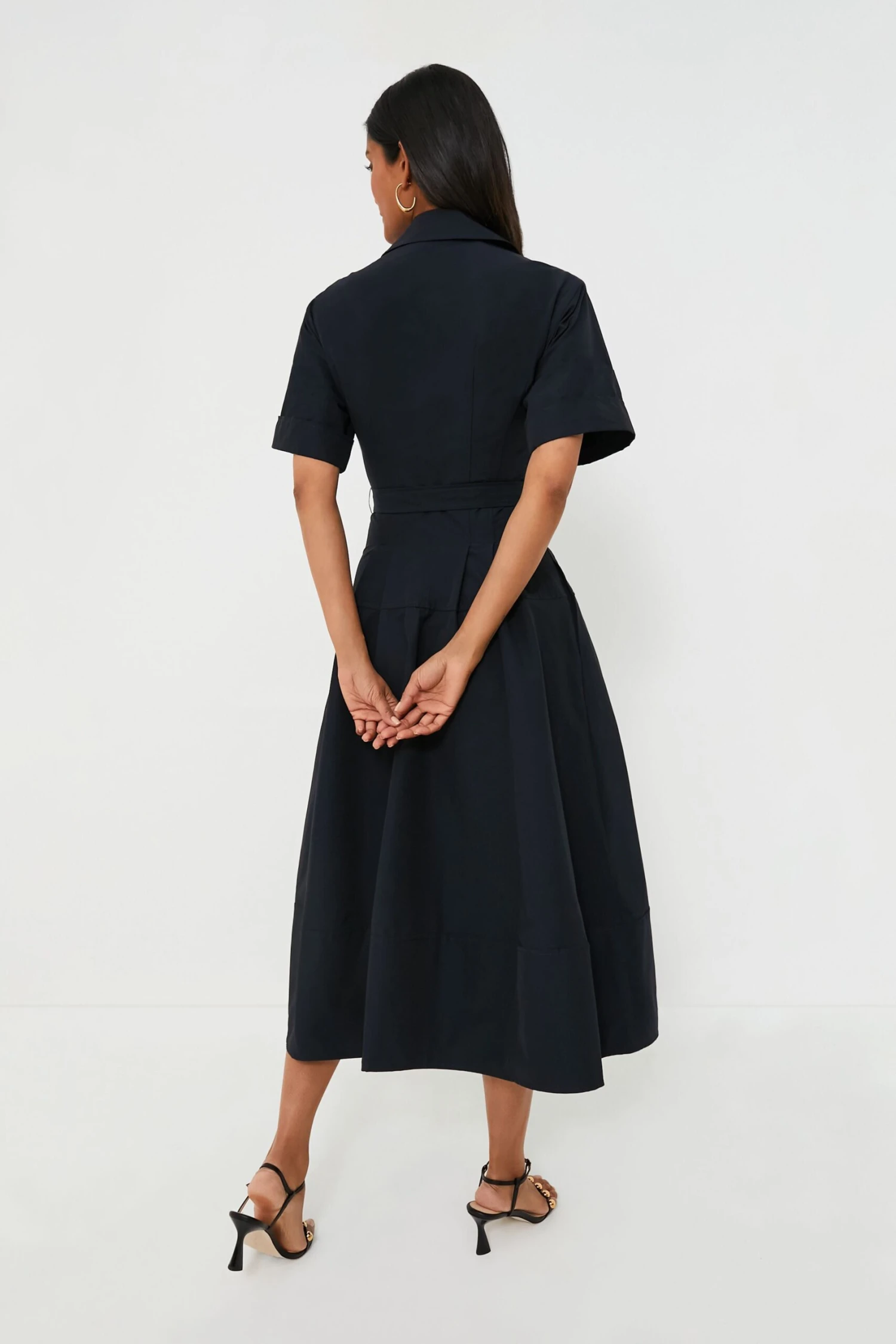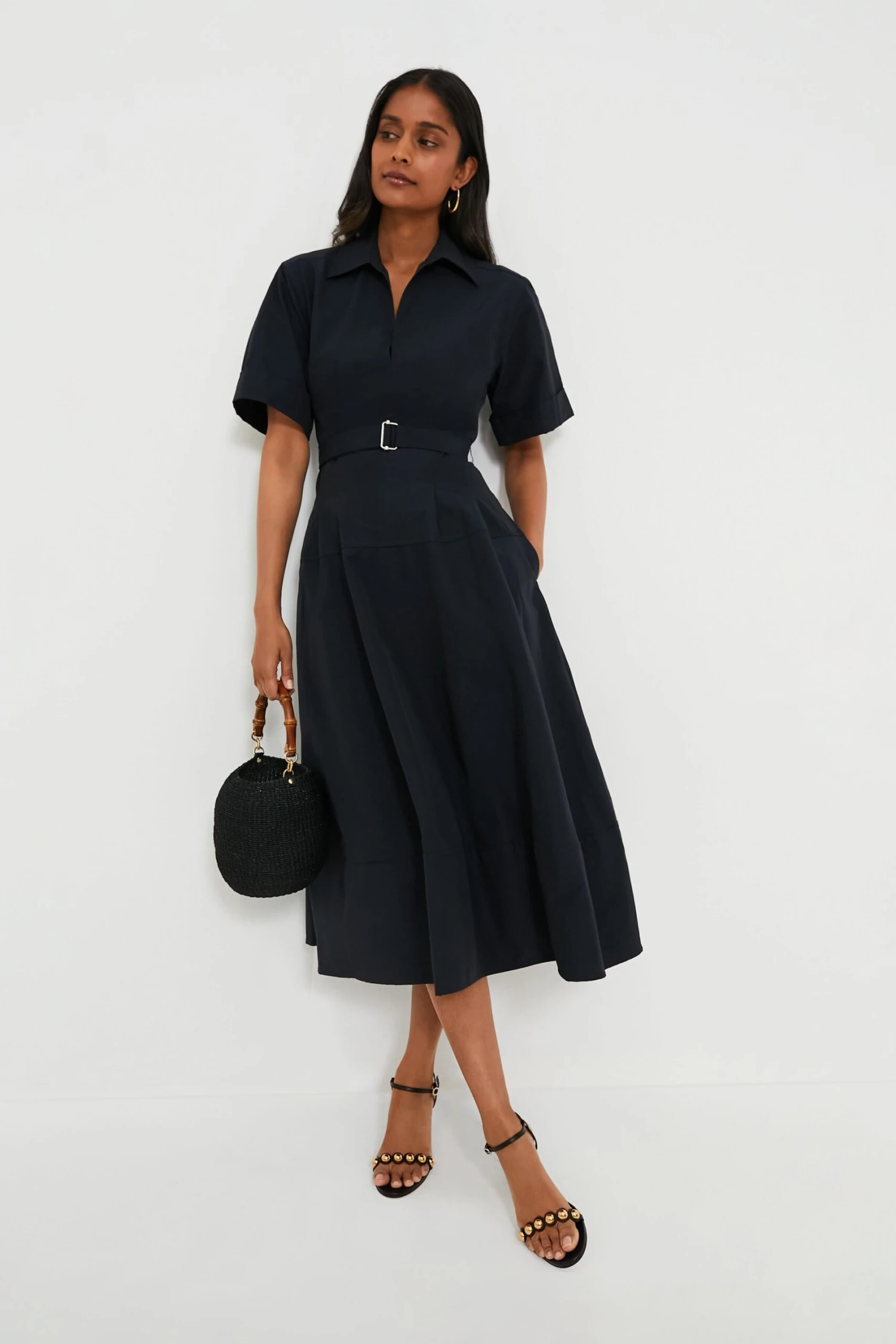 Inspired by a tailored dress shirt, the Midnight Deanna Short Sleeve Belted Midi Dress is a sophisticated style with flattering, feminine details. Made with a deep V-neckline, spread collar, and short cuffed sleeves, this easy style is elevated with an adjustable waistband. The pleated A-line skirt adds to the vintage silhouette, creating a look that goes nicely with everything from heels to ballet flats.