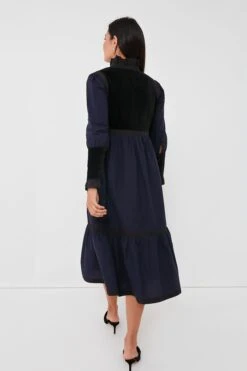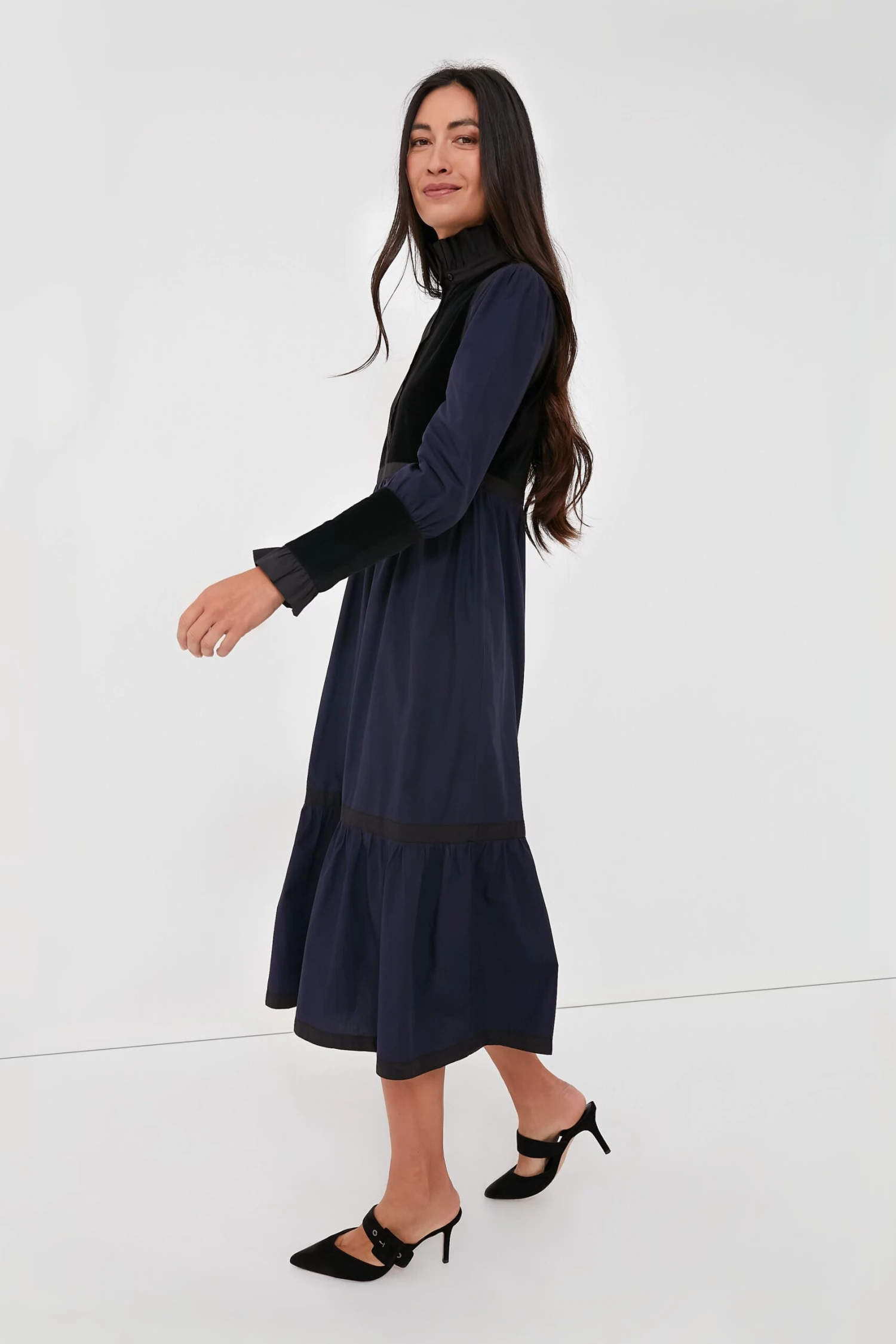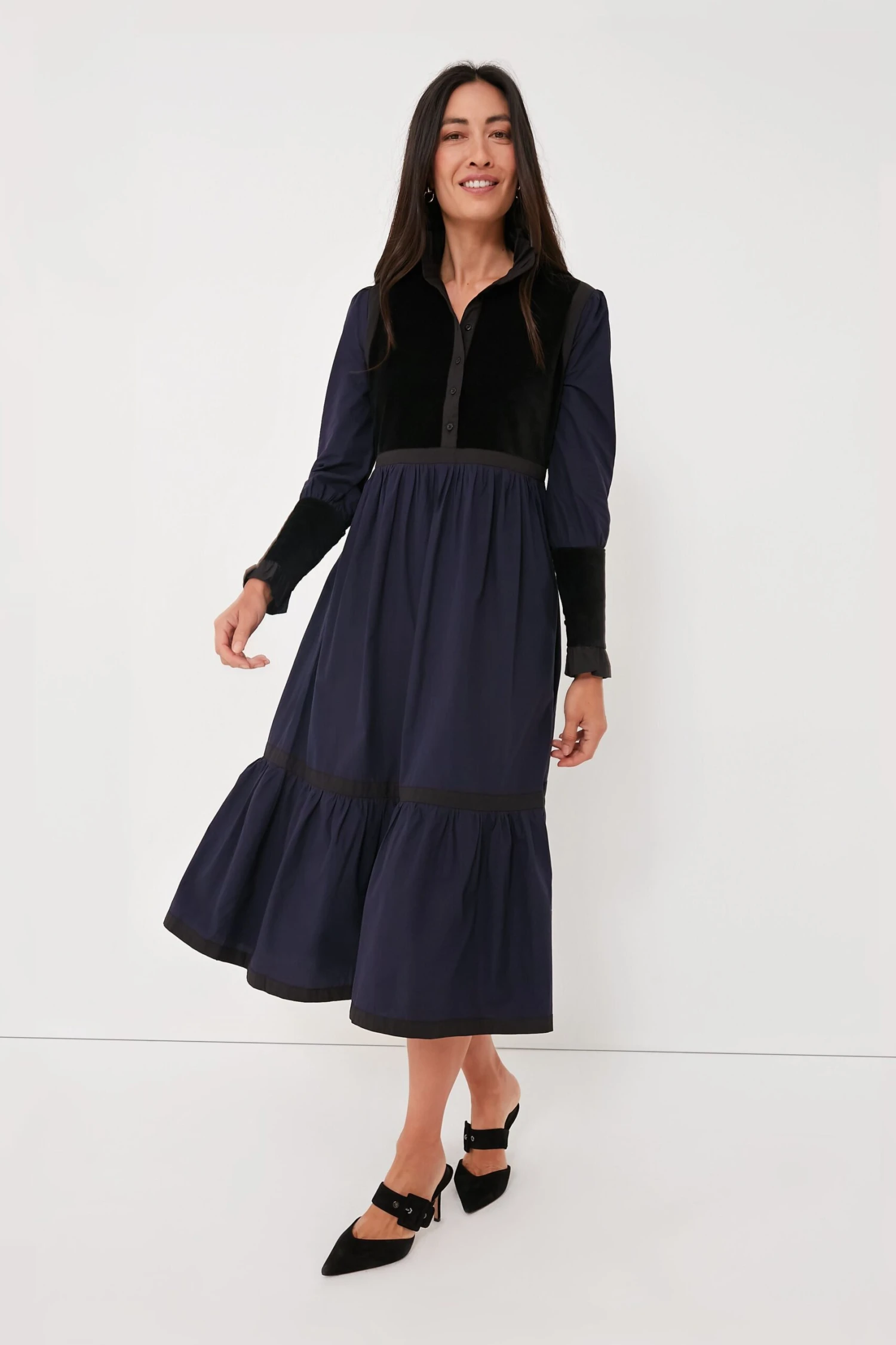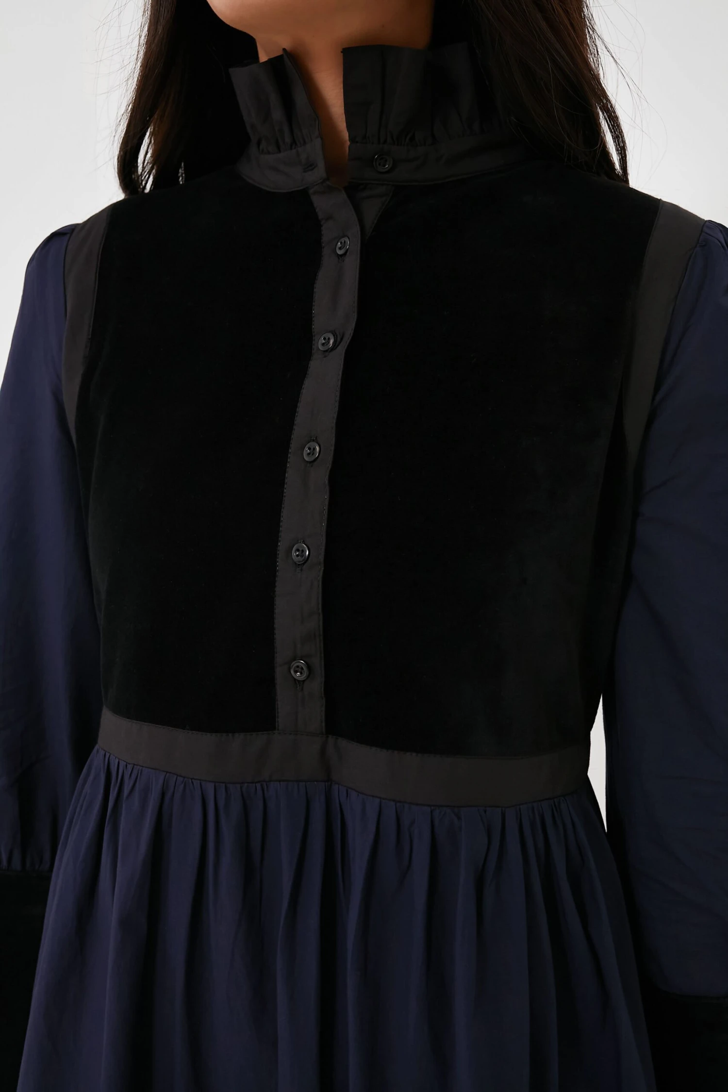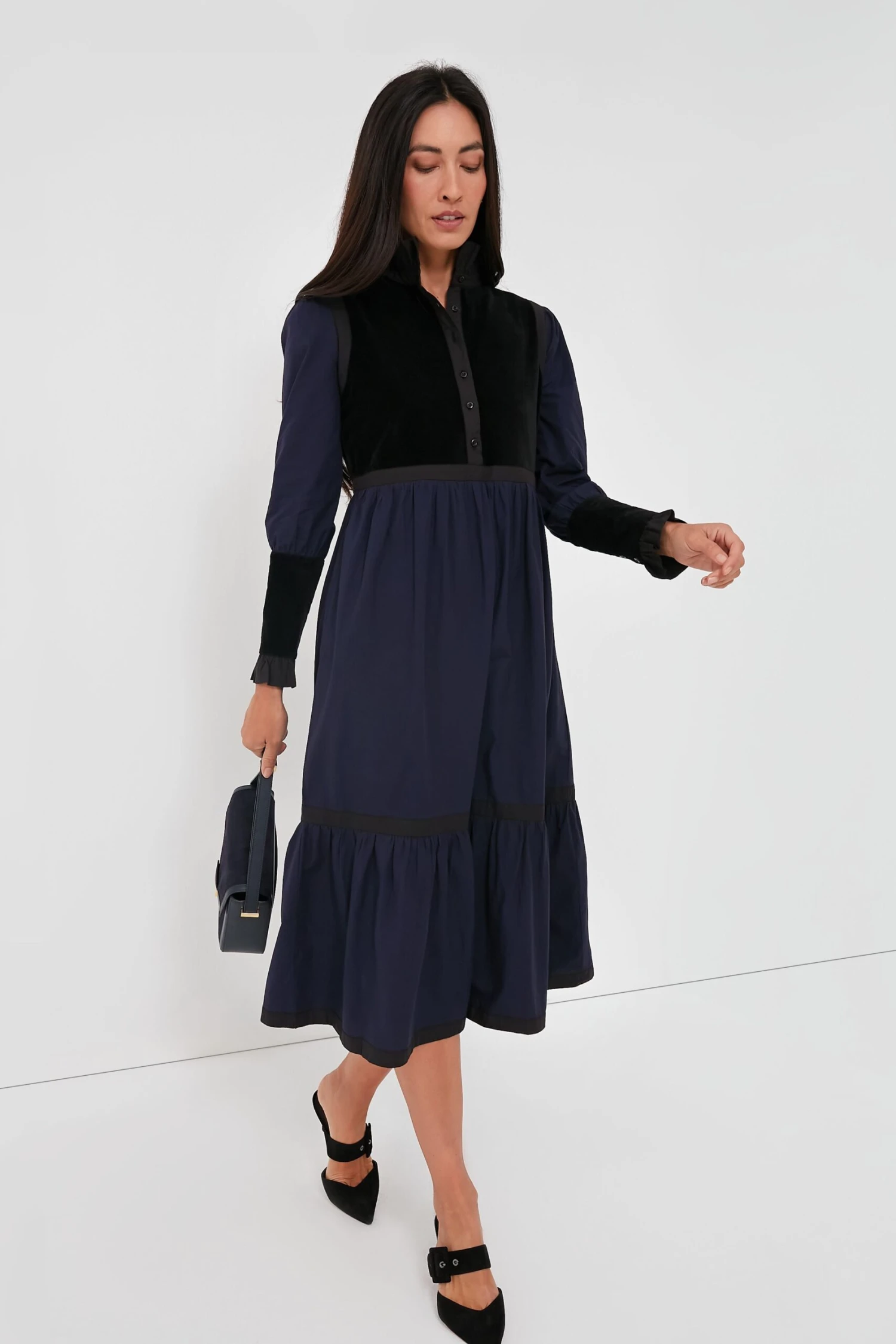 Crafted from a crisp cotton with a contrasting velvet bodice, the Navy Kavita Dress is chic without compromising functionality. Featuring romantic ruffles along the collar and cuffs, this piece is distinctly feminine without being too sweet. Perfect for dinner parties and upcoming social events, we are styling this midi with heels and a handbag for an elegant ensemble, or with leather boots and gold hoops for a day of exploring a new city.