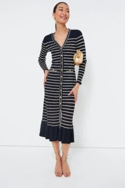 Sophisticated and chic, the Navy Stripe Marina Dress is a versatile style that can be worn for countless occasions. A cardigan-inspired dress with a fit-and-flare silhouette and bracelet sleeves, this midi is ultra-flattering and can be worn throughout the year. Pair with heels and a shoulder bag for an elevated dinner look, or with ballet flats for work meetings.
