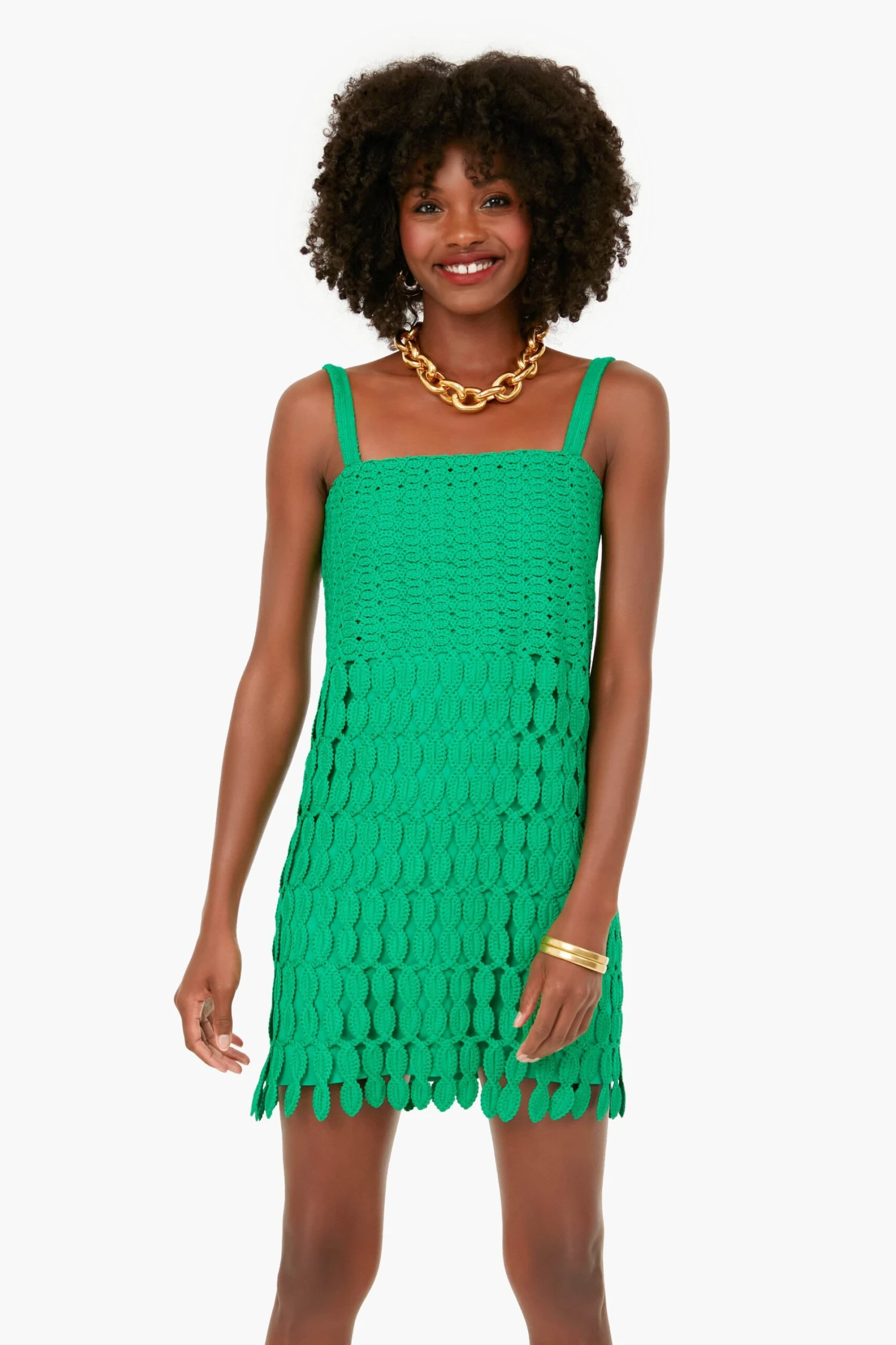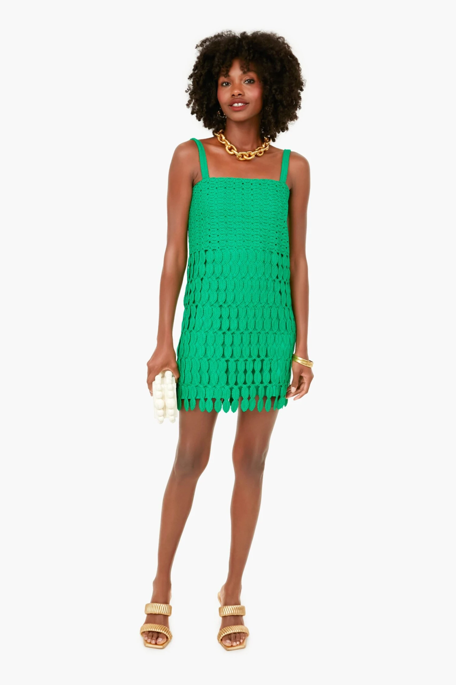 The Velies mini dress brings elevated bohemian style with a tailored embroidered bodice, a square neckline, and a scalloped lace hem tied together with a chic crochet overlay. The rich green hue is the perfect color to compliment sun kissed skin on a warm summer night. Style with gold accessories for a lux look that is sure to wow.