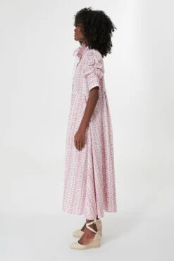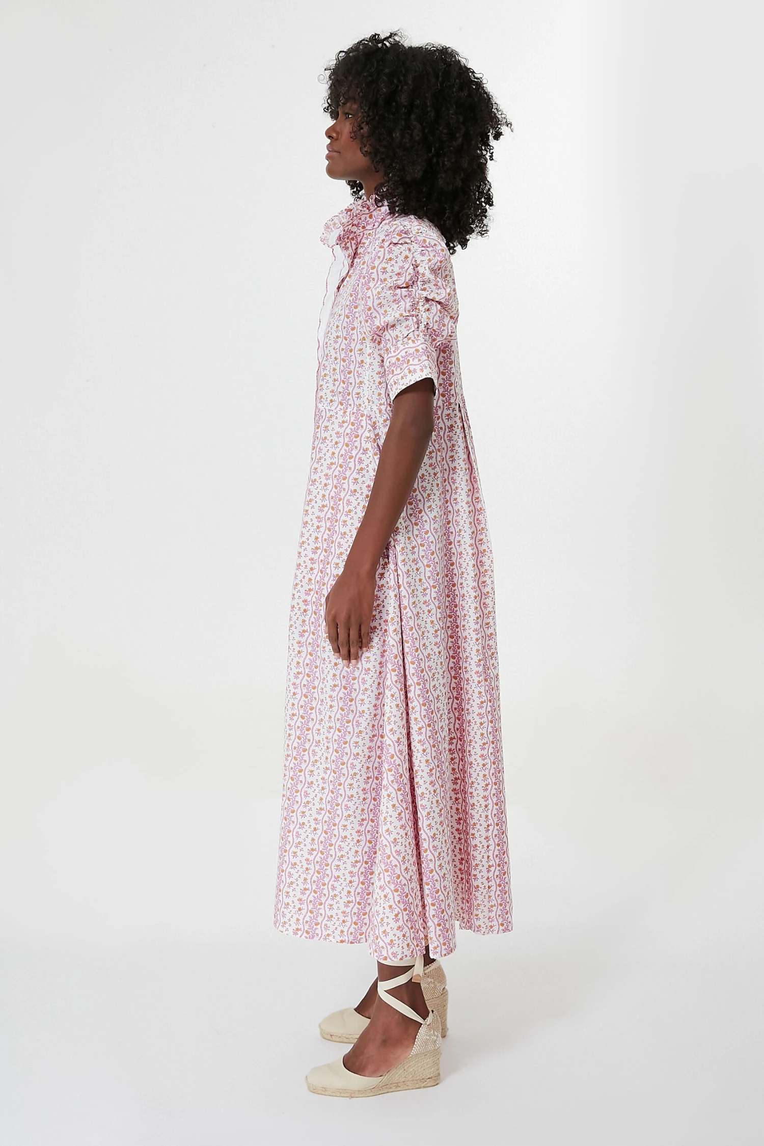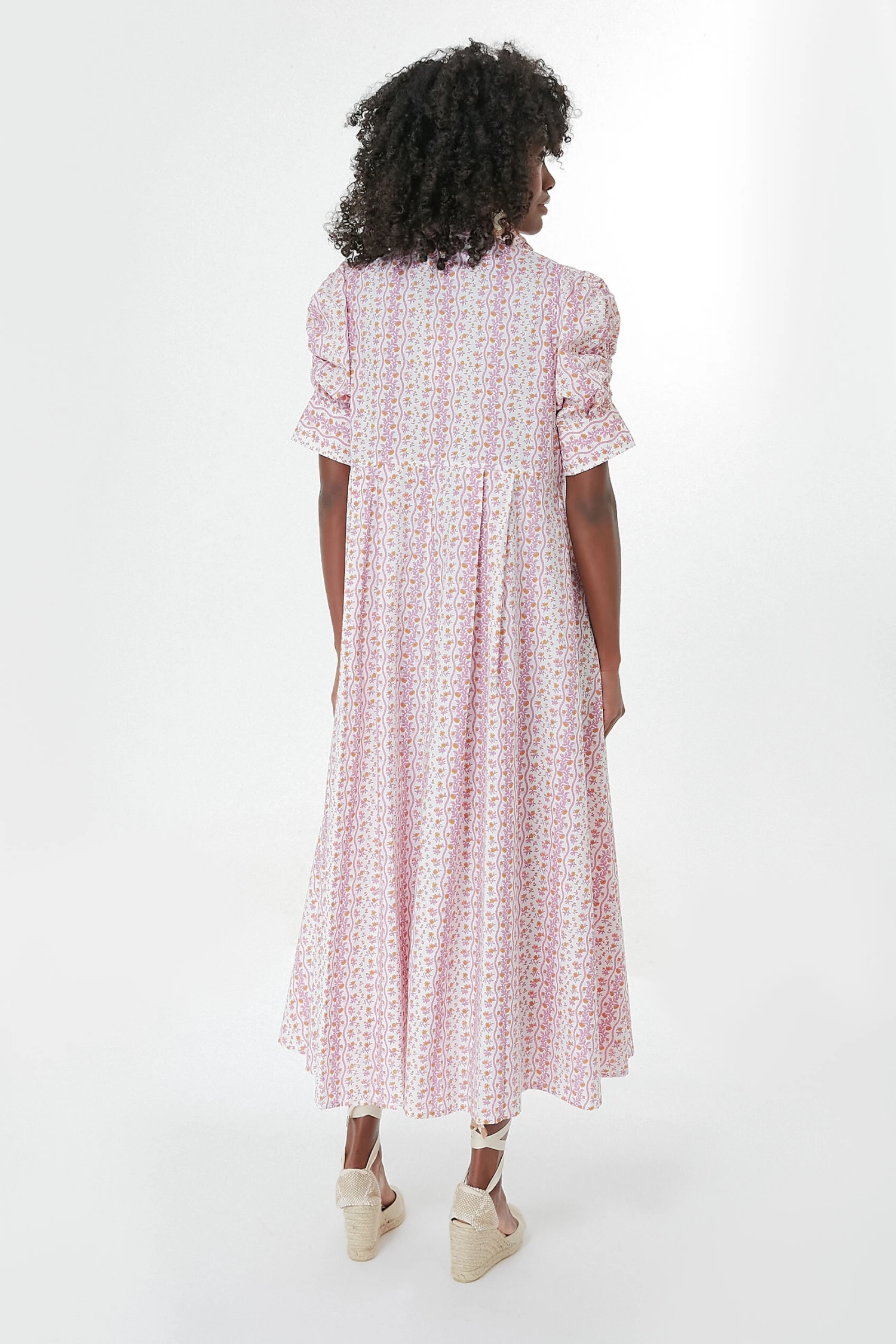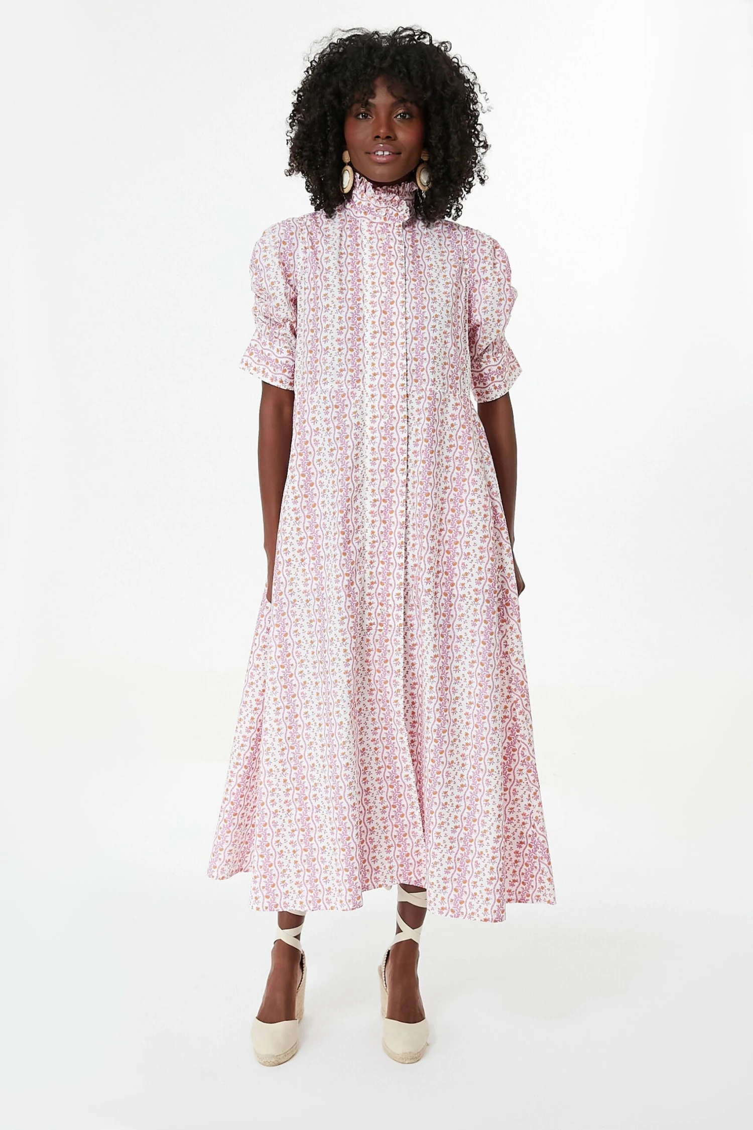 With its frilled collar and gigot sleeves, the Pink Floral Venetia Midi Dress is a nod to the Edwardian era. This midi features a rosy hand-block printed “serpentine stripes” motif inspired by a Georgian pattern that was captured through a window of a ravishing 18th century folly in Denmark. In a feminine colorway and relaxed silhouette that is flattering for all, this stunner deserves a spot in your bag for your next vacation.