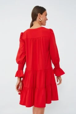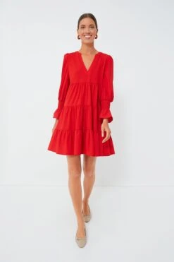 Introducing the a customer favorite, the Crepe Kenzo Dress. Featuring feminine flutter smocked cuffs, a V-neckline and a loose empire waist, this is the most flattering flirty frock! In a fiery red shade, pair this sassy number with flats for a casual look or dress up with heels and statement earrings for date night.