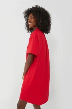 Your favorite polo just got an upgrade! The Red Oakley Dress is the ideal out-the-door dress for busy days where you still want to look put together. The mini length and breathable frame allow for maximum comfort, while the snap-button detailing and spread collar give a suave touch. The bright red is the pièce de résistance, providing a fun and modern twist on a classic shape. We are pairing this look with sneakers and a tote for a day of shopping, and with flats and a cardigan for an elevated look.