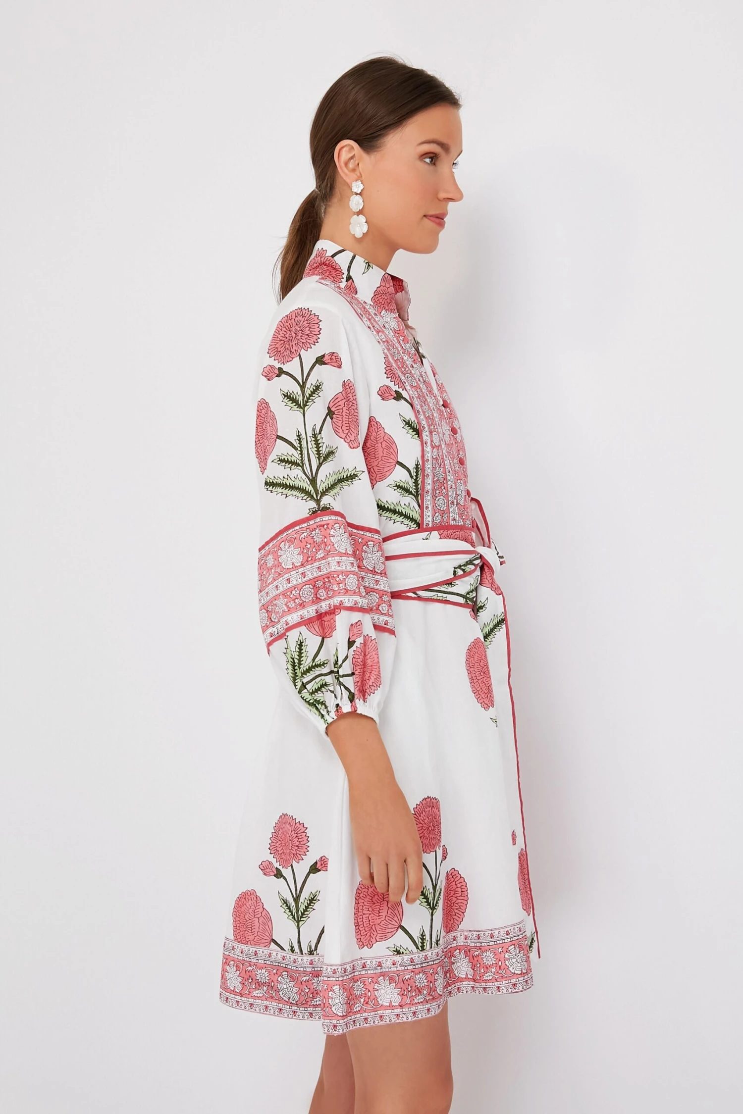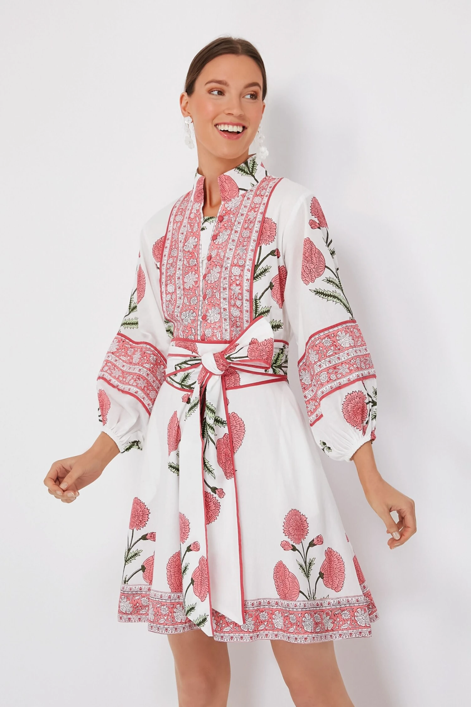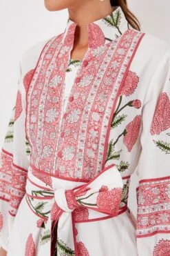 One of our favorites now here in a flirty mini length, the Rosy Marigold Flounce Shorty Dress features saturated pink florals that are perfect for warm weather ahead. This signature silhouette was based on a concept for a comfy caftan that allows ease of movement and creates a relaxed yet put-together look. The details are endless here — a Nehru stand collar, covered buttons at the half placket, and a self-tie waist sash are just a few that we are loving. This closet-favorite is a magnificent wear-everywhere style, so pair with espadrilles and a raffia bag for dinner at the beach club, or with sandals and sunglasses to meet your girls for happy hour.