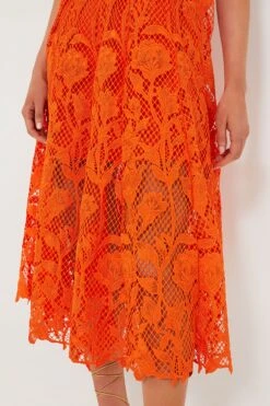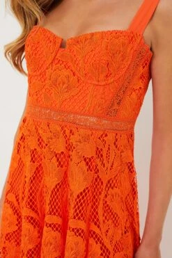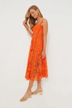 Timeless design meets a head-turning palette in the Orange Lace Midi Dress, cut from lily lace in a sunset hue. Its flattering wide straps, bustier-style bodice and full skirt are ideal for warm-weather weddings, soirees, and dinner dates alike. Pair with heels and vibrant jewelry for a show-stopping ensemble.