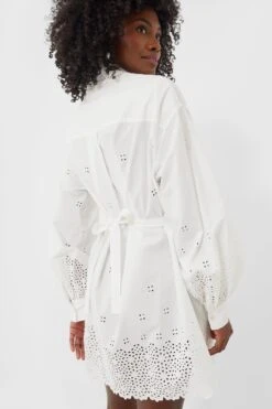 The Cowrie Gemma Dress is the perfect white warm-weather frock your wardrobe needs. Featuring a flattering cinched waist, a self-tie at back for easy fitting, and long blouson sleeves for added feminine charm! This fresh eyelet mini wears just as easily to the farmers market with sandals and a tote as it does to brunch with friends!