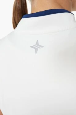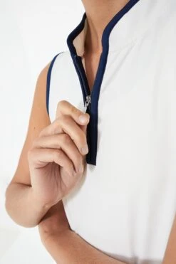 Vintage inspired but updated for the modern woman, this quarter zip, drop waist tennis dress brings the heat on and off the court. The chic mandarin collar accented with a navy blue piping is simple and streamlined to compliment the swing skirt and boxy shape.