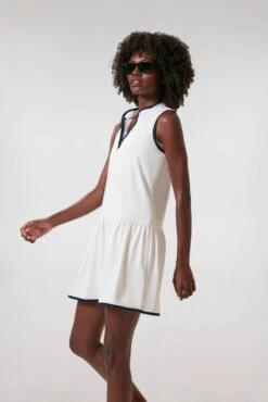 Vintage inspired but updated for the modern woman, this quarter zip, drop waist tennis dress brings the heat on and off the court. The chic mandarin collar accented with a navy blue piping is simple and streamlined to compliment the swing skirt and boxy shape. Style with the Blue Bouquet Sports Bra and Compression Shorts for a feminine, floral touch to this classic and clean look.