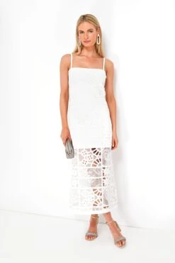 A slinky and body-skimming number that we are fully obsessed with, the White French Cut Lace Bronze Dress takes a classic column silhouette and elevates it to new heights. With an elegant square neckline and thin shoulder straps, this maxi is lined to mini length and adorned with intricate cutwork and lace details, making it a one-of-a-kind style. Perfect for warm-weather brides, or for those looking to stand out on vacation or at garden parties this season, just pair with sandals and a clutch.